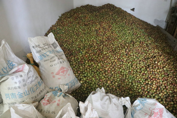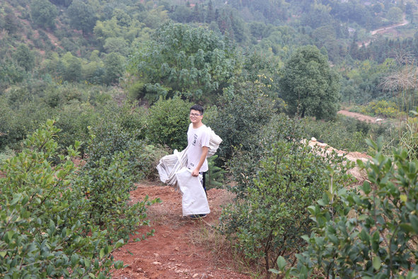 油茶采摘下來,裝滿了一個個袋子,負責(zé)搬運的小伙,已是滿頭大汗,同時忙的不亦樂乎。